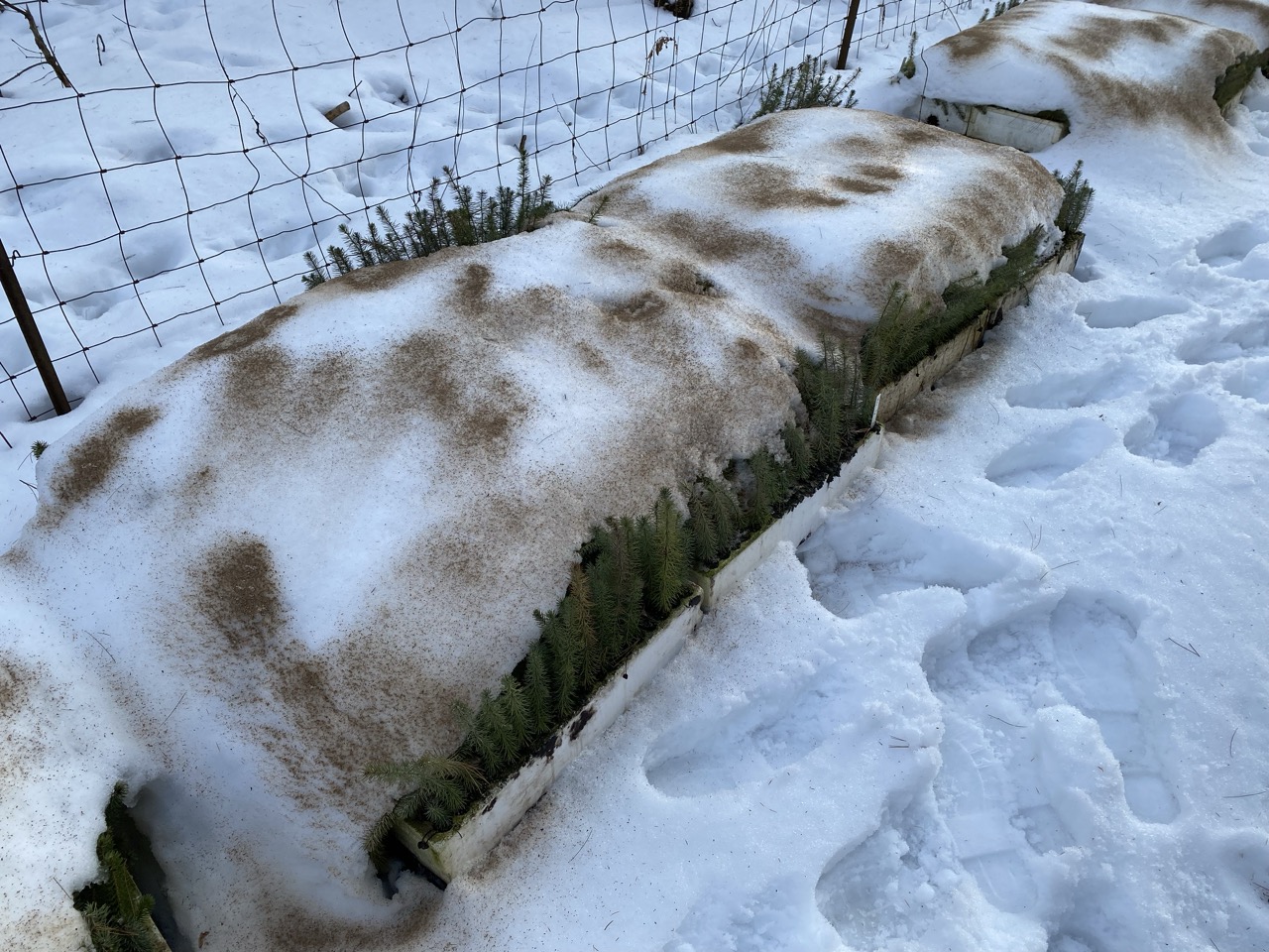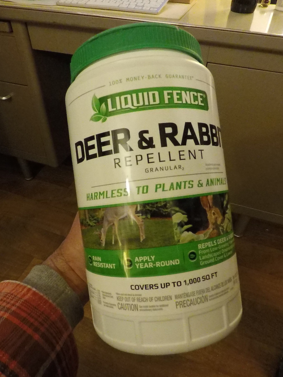 As of winter 2019/2020, we now swear by “Deer And Rabbit Repellent“, a granular product made by Liquid Fence [this is not a paid endorsement, just free advice]. The product label says it contains “putrescent whole egg solids, garlic, sodium lauryl sulfate, thyme oil, and other ingredients”. Reviewers online say it may not be very effective for rabbits, but I will say this: the deer completely avoided our crops after application. The difference was immediate and effective. The container does not dispense the granular product very well, so I poured it into a screened pasta strainer with a good handle on it. This made physically applying the product much easier, and I was able to apply it much more evenly as well.